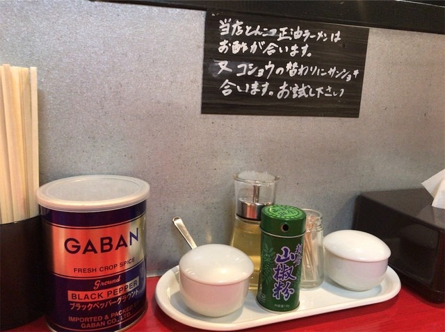 通常のとんこつラーメンには、おろしにんにくや豆板醤を合わせることが多いですが、それに加えて玄翁では、「お酢」と「山椒」がよく合います。